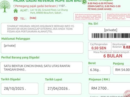 Harapan hasil pajak gadai merujuk kepada proyeksi pendapatan yang dijangka diterima oleh sebuah kedai emas daripada aktiviti pemberian pinjaman berasaskan cagaran barang kemas. Ini adalah ramalan kewangan penting untuk perniagaan seperti yang terletak di Lor Taman Lo Chung, Beaufort, bagi merancang operasi dan pertumbuhan dengan lebih efektif.